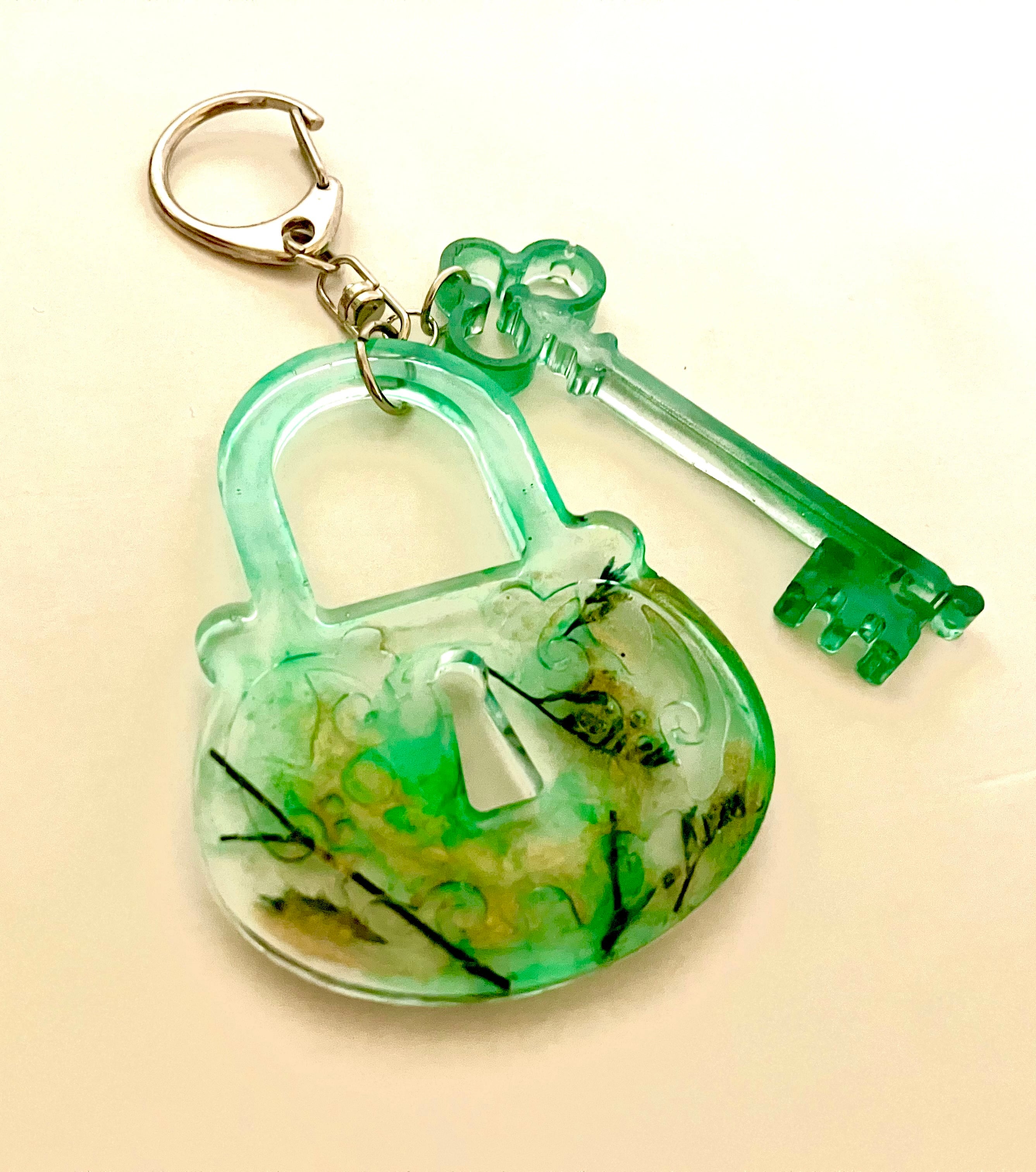 草花を封じ込めた美しい鍵のバッグチャーム。自然の息吹が感じられる緑と、透明感あふれるデザインが特徴です。