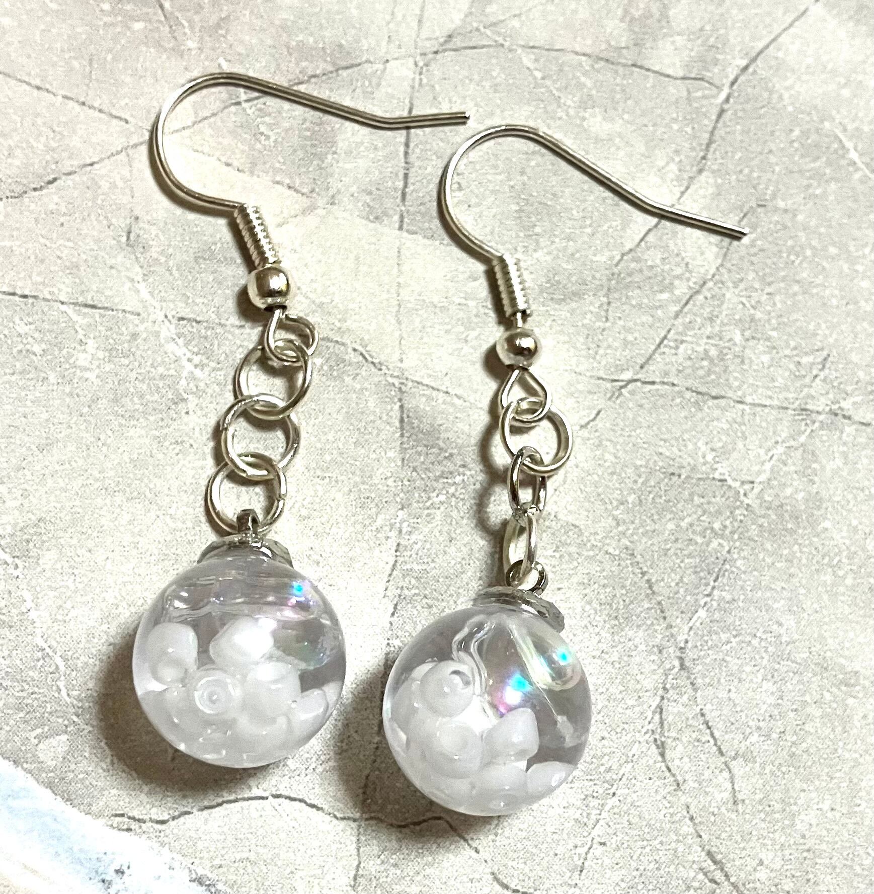 このピアスは、雲を彷彿とさせるビーズと上品なレジン素材を使用して作られた、美しい白いピアスです。